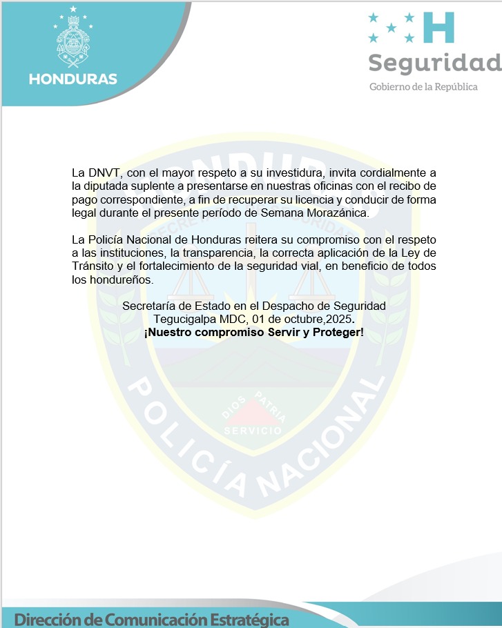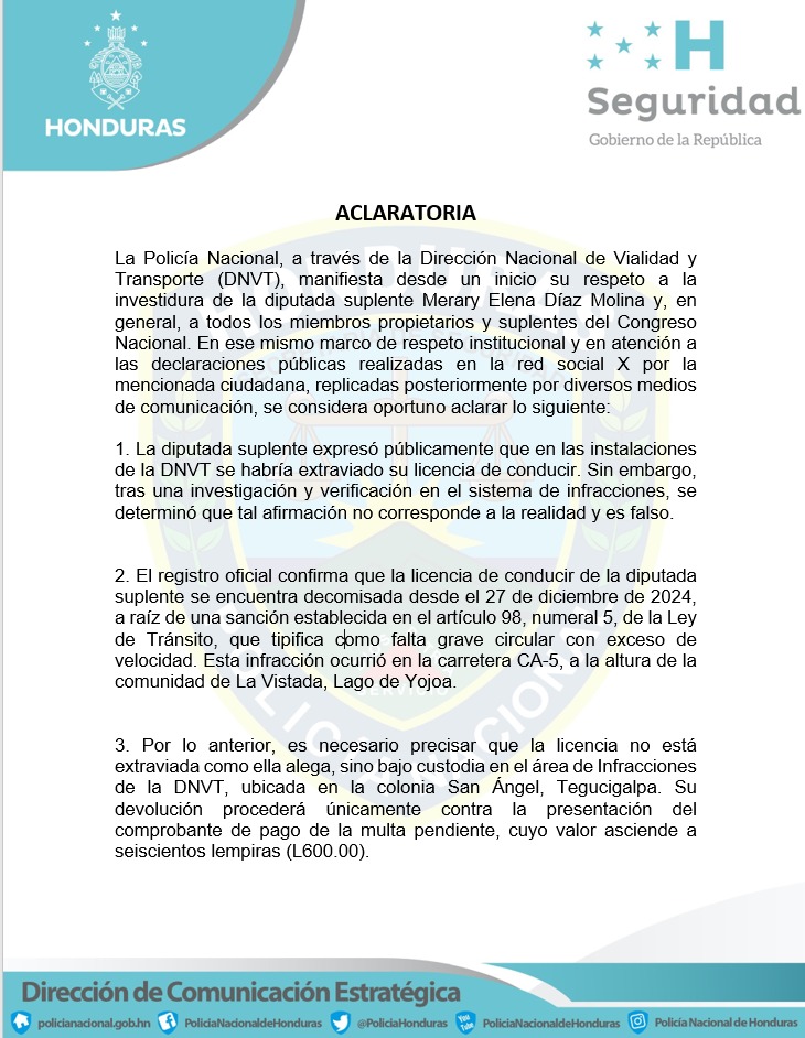 38 La Policía Nacional de Honduras a través de la Dirección Nacional de Vialidad y Transporte aclara lo siguiente: