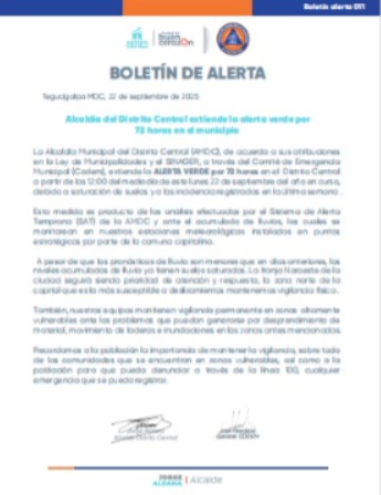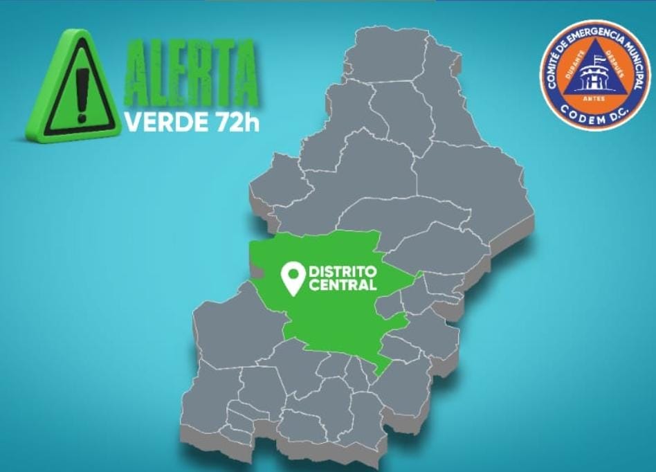 La Alcaldía Municipal del Distrito Central (AMDC), de acuerdo a sus atribuciones en la Ley de Municipalidades y el SINAGER, a través del Comité de Emergencia Municipal (Codem), extiende la ALERTA VERDE por 72 horas en el Distrito Central a partir de las 12:00 del mediodía de este lunes 22 de septiembre del año en curso, debido a saturación de suelos y a las incidencia registradas en la última semana .