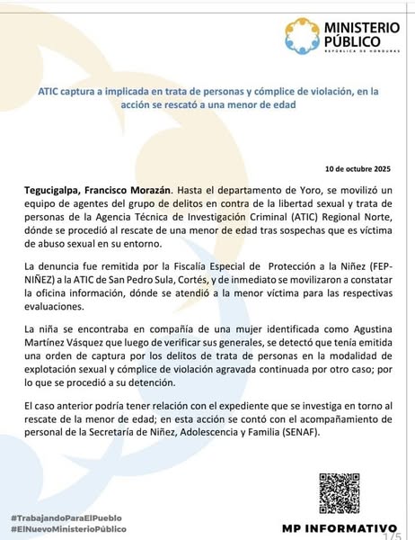 La denuncia fue remitida por la Fiscalía Especial de Protección a la Niñez (FEP-NIÑEZ) a la ATIC de San Pedro Sula, Cortés, y de inmediato se movilizaron a constatar la oficina información, dónde se atendió a la menor víctima para las respectivas evaluaciones.