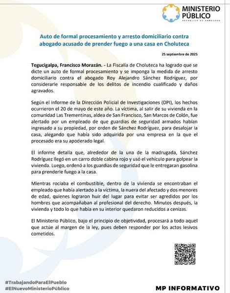 Tegucigalpa, Francisco Morazán. – La Fiscalía de Choluteca ha logrado que se dicte un auto de formal procesamiento y se imponga la medida de arresto domiciliario contra el abogado Roy Alejandro Sánchez Rodríguez, por considerarle responsable de los delitos de incendio cualificado y daños agravados.
