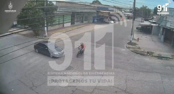 Mediante el constante monitoreo de las cámaras del Sistema Nacional de Emergencias 911 Ubicadas en la ciudad de San Pedro Sula, captó un accidente de tránsito tipo colisión entre un vehículo tipo turismo y una motocicleta en la 8 calle, 7 avenida.
