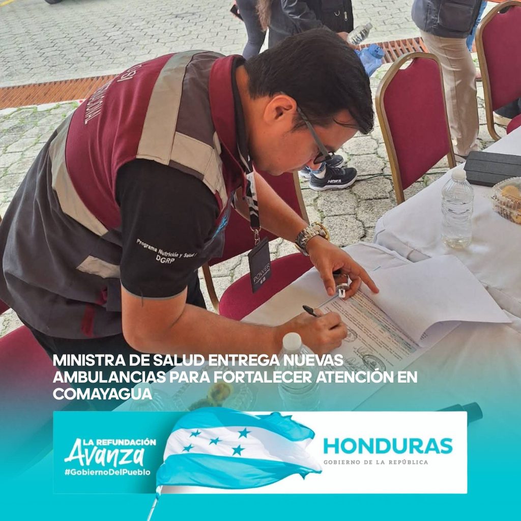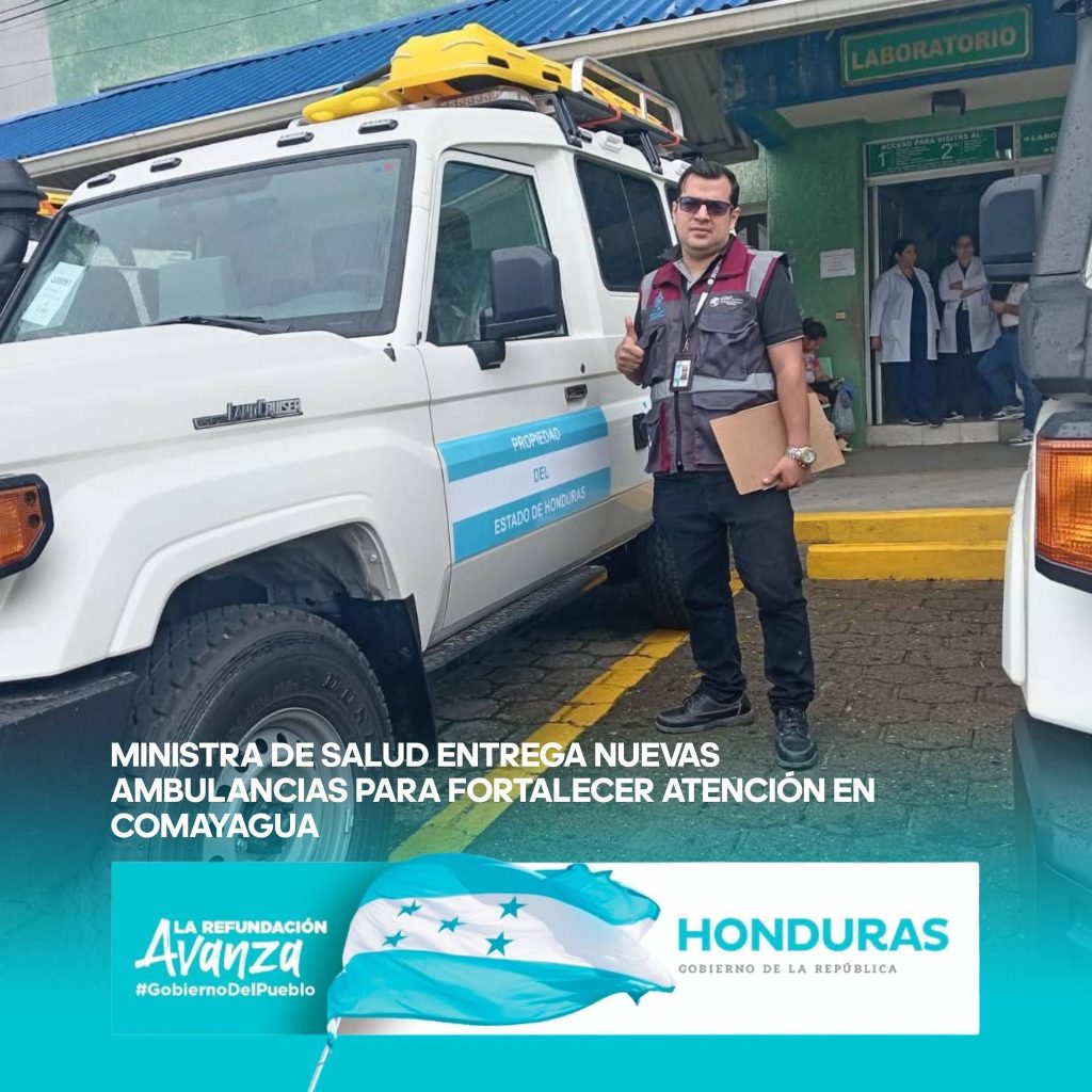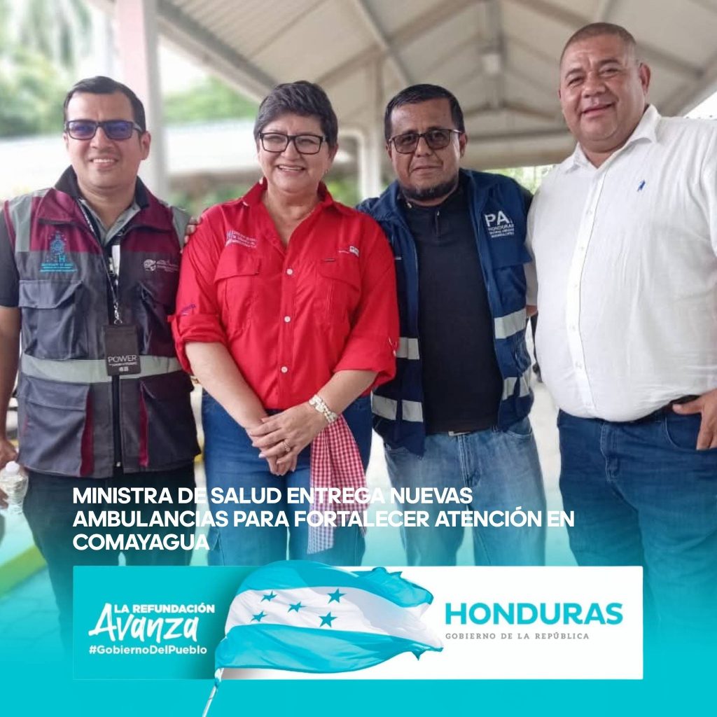 La ministra de Salud, Carla Paredes, entregó oficialmente dos nuevas ambulancias a la Región Sanitaria de Comayagua, dirigida por el doctor Orlin Castillo, con el objetivo de fortalecer la red de emergencias y mejorar la atención prehospitalaria en los municipios del departamento.