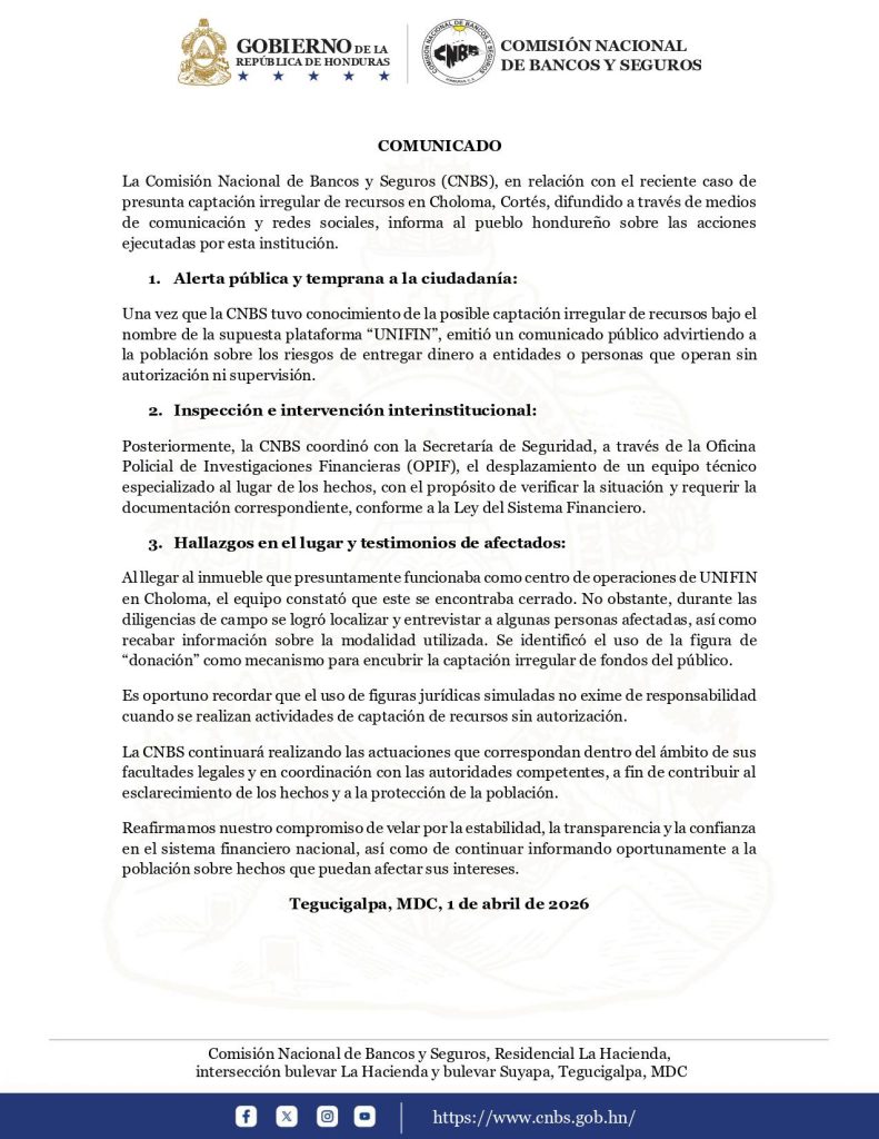 La Comisión Nacional de Bancos y Seguros (CNBS), informa a la población hondureña sobre las acciones realizadas ante recientes hechos de interés público relacionados con posibles actividades financieras irregulares.