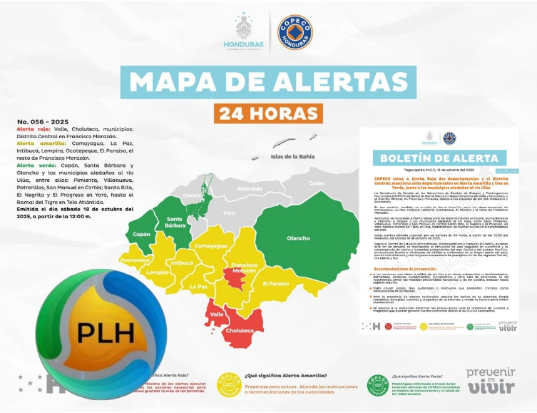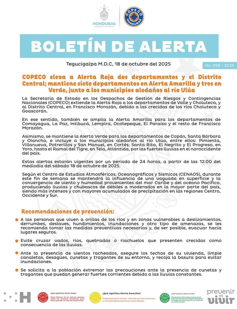 Inicio » COPECO ELEVA A ALERTA ROJA DOS DEPARTAMENTOS Y EL DISTRITO CENTRAL; MANTIENE SIETE DEPARTAMENTOS EN ALERTA AMARILLA Y TRES EN VERDE, JUNTO A LOS MUNICIPIOS ALEDAÑOS AL RÍO ULÚA