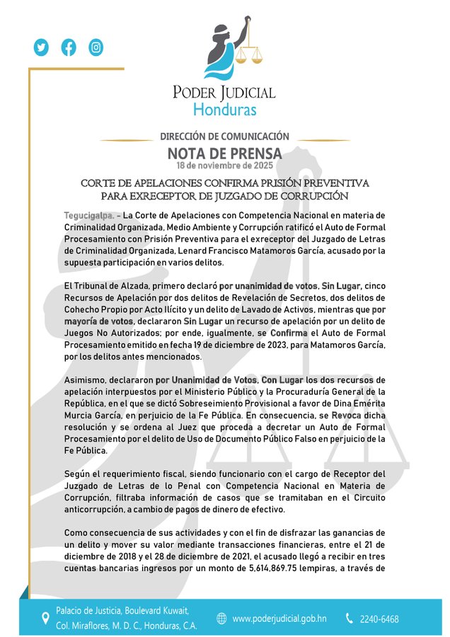 Inicio » CORTE DE APELACIONES CONFIRMA AUTO DE FORMAL PROCESAMIENTO PARA EXRECEPTOR LEONARD FRANCISCO MATAMOROS ACUSADO DE REVELACIÓN DE SECRETOS, COHECHO, JUEGOS DE AZAR NO AUTORIZADOS Y LAVADO DE ACTIVOS