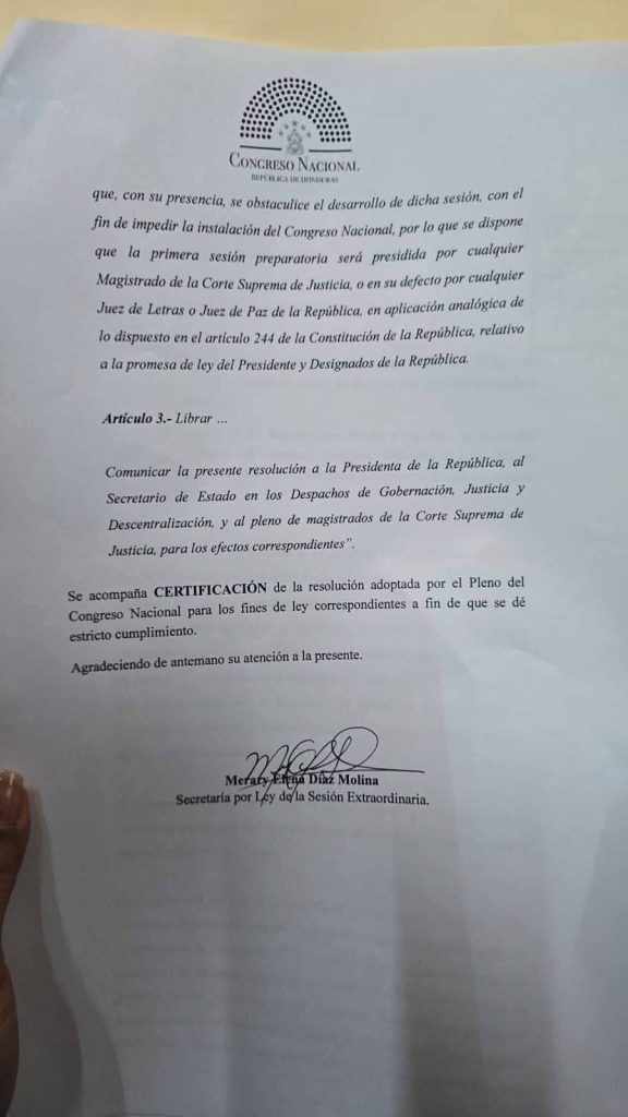Merary Elen Díaz Molina, Secretaria por Ley de la sesión extraordinaria, firmó la comunicación oficial dirigida a los magistrados de la Corte Suprema, solicitando “estricto cumplimiento” de la resolución y notificando también a la Presidenta de la República y al Secretario de Gobernación.