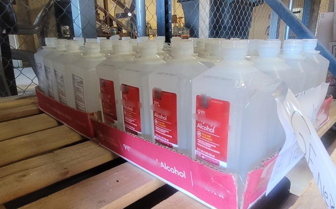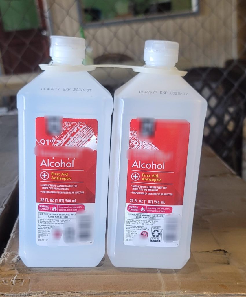 En la revisión encontraron 48 envases de alcohol isopropílico al 91%, de origen estadounidense y con capacidad de 946 mililitros cada uno, valorados en el mercado en aproximadamente 35,000 lempiras.