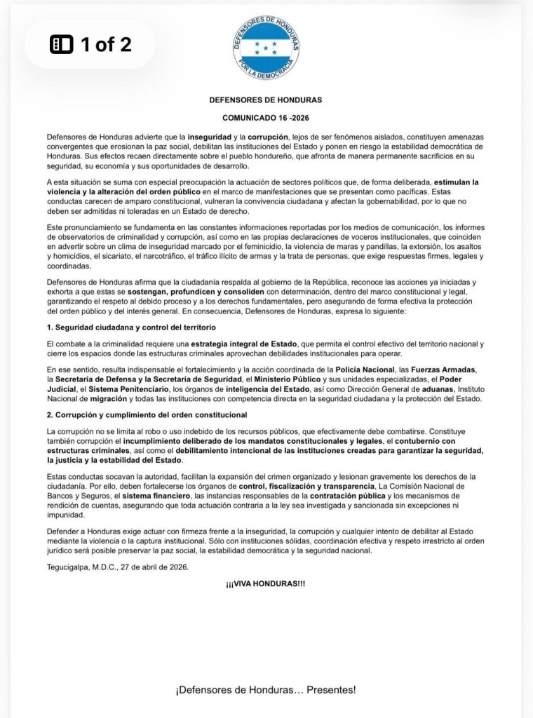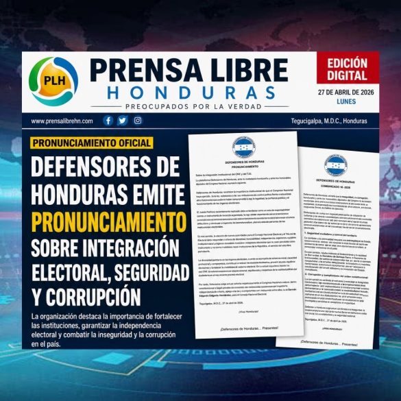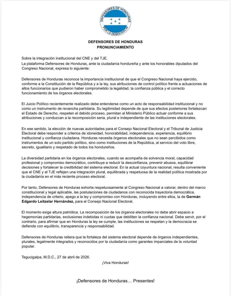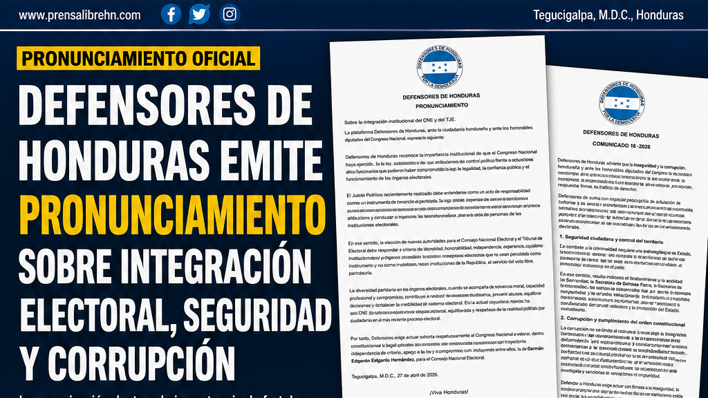 Tegucigalpa, M.D.C., 27 de abril de 2026.– La organización Defensores de Honduras hizo público un pronunciamiento en el que aborda temas relacionados con la integración de los órganos electorales, así como la situación de seguridad y corrupción en el país, planteando una serie de consideraciones y llamados a las autoridades.