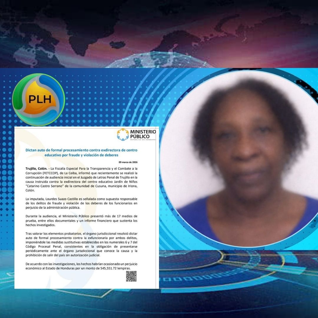Trujillo, Colón. – La Fiscalía Especial Para la Transparencia y el Combate a la Corrupción (FETCCOP), de La Ceiba, informó que recientemente se realizó la continuación de audiencia inicial en el Juzgado de Letras Penal de Trujillo en la causa instruida contra la exdirectora del centro educativo Jardín de Niños “Catarino Castro Serrano” de la comunidad de Cusuna, municipio de Iriona, Colón.