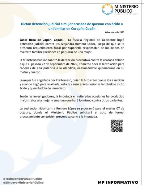 El Ministerio Público solicitó la detención preventiva contra la acusada debido a que el pasado 22 de septiembre de 2025, Romero López le lanzó ácido para cañerías de alta potencia a la ofendida, ocasionándole quemaduras en su rostro y cuerpo.