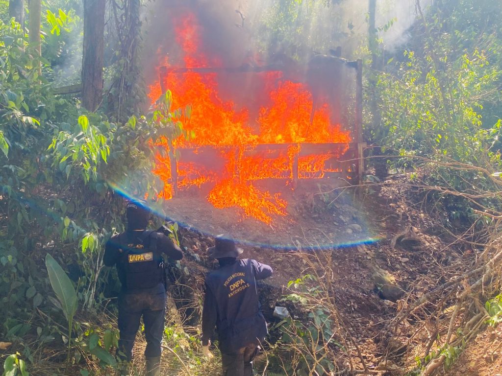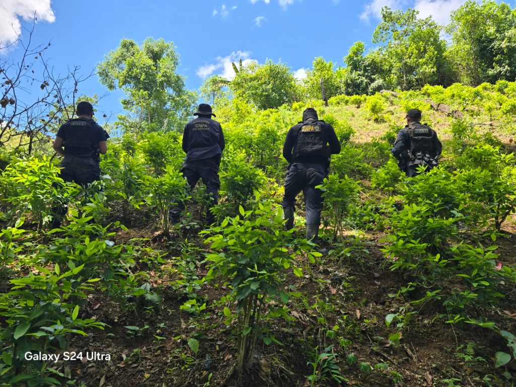 San Esteban, Olancho. 10 de octubre de 2025. Agentes de la Dirección Nacional Policial Antidrogas (DNPA), realizaron la erradicación e incineración de 48,000 arbustos de hoja de coca, así como la destrucción de un laboratorio rústico empleado para el procesamiento de pasta base de coca, en una zona montañosa de la aldea Río Grande, municipio de San Esteban, Olancho.