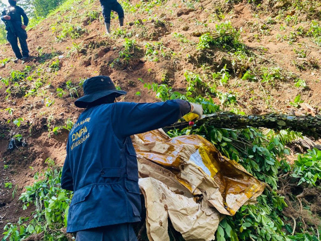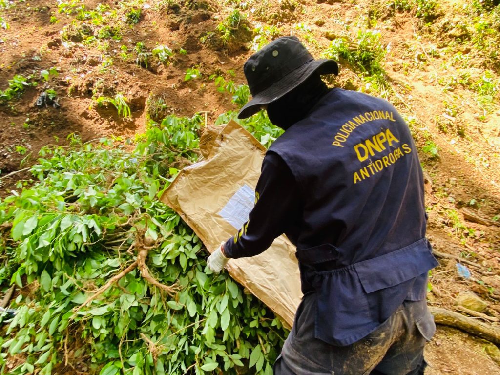 La plantación estaba distribuida en dos parcelas: la primera, con una extensión de cuatro manzanas, contenía aproximadamente 32,000 arbustos de hoja de coca; mientras que la segunda, de dos manzanas, albergaba alrededor de 16,000 arbustos.