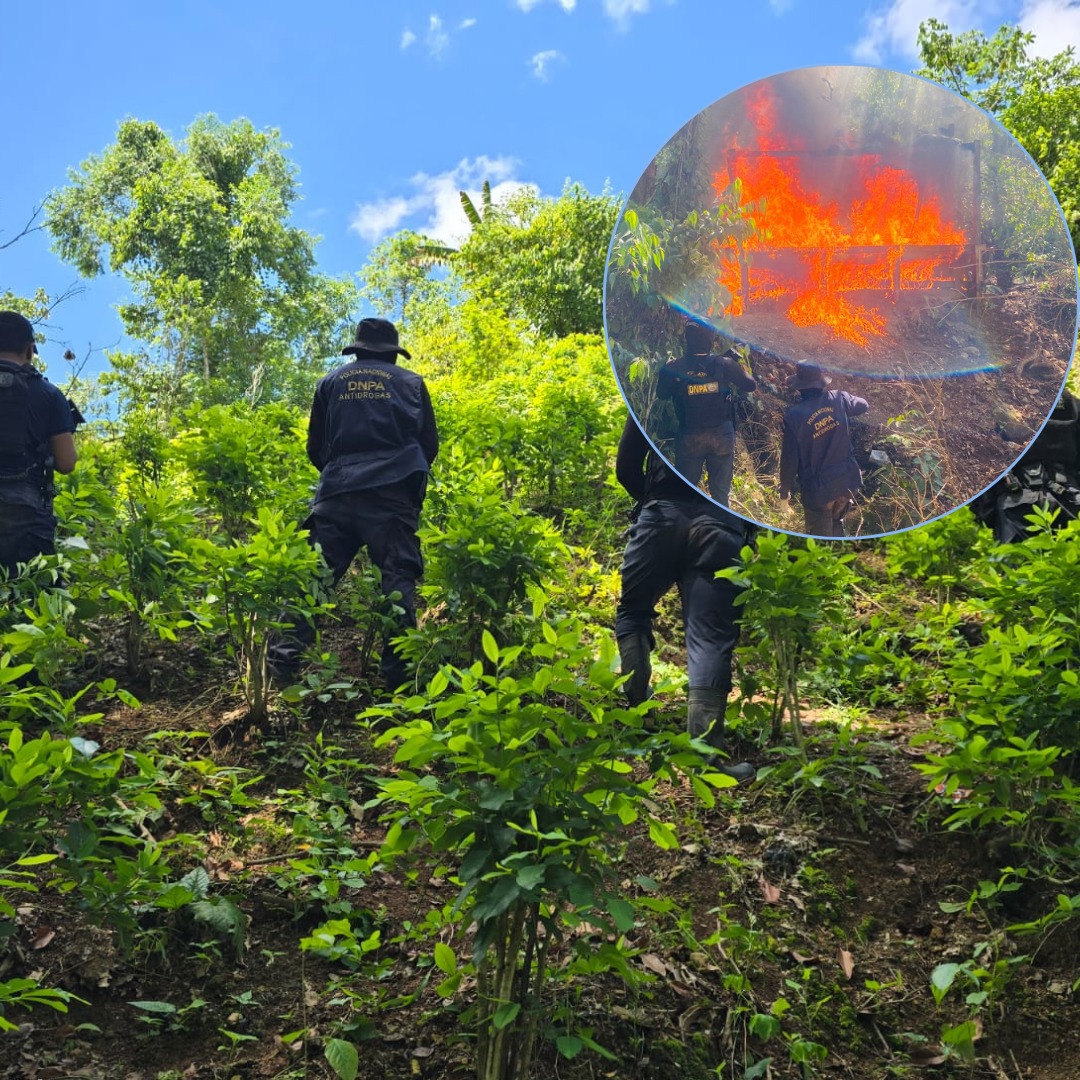 La plantación estaba distribuida en dos parcelas: la primera, con una extensión de cuatro manzanas, contenía aproximadamente 32,000 arbustos de hoja de coca; mientras que la segunda, de dos manzanas, albergaba alrededor de 16,000 arbustos.