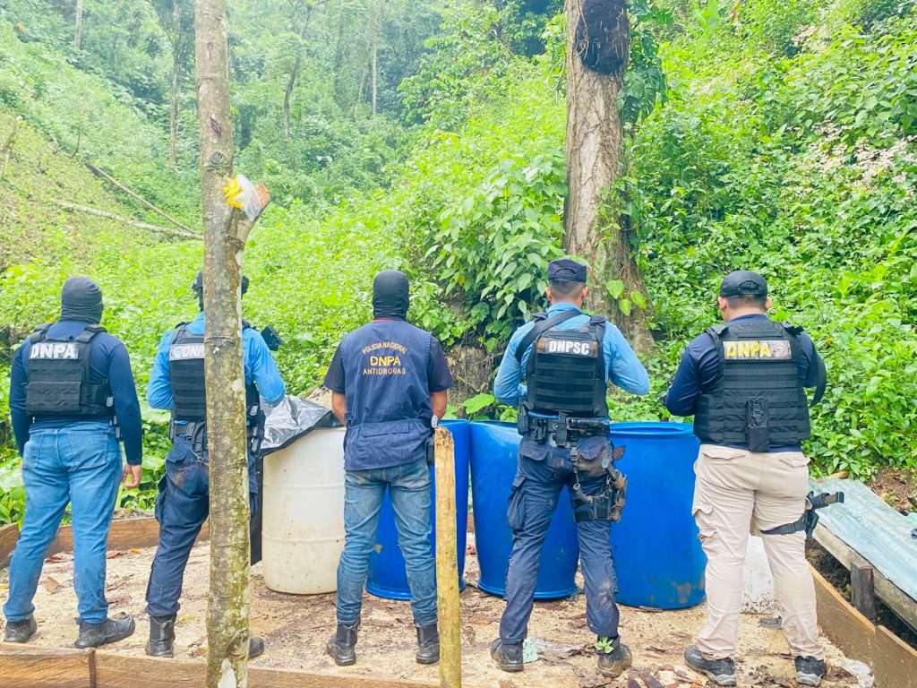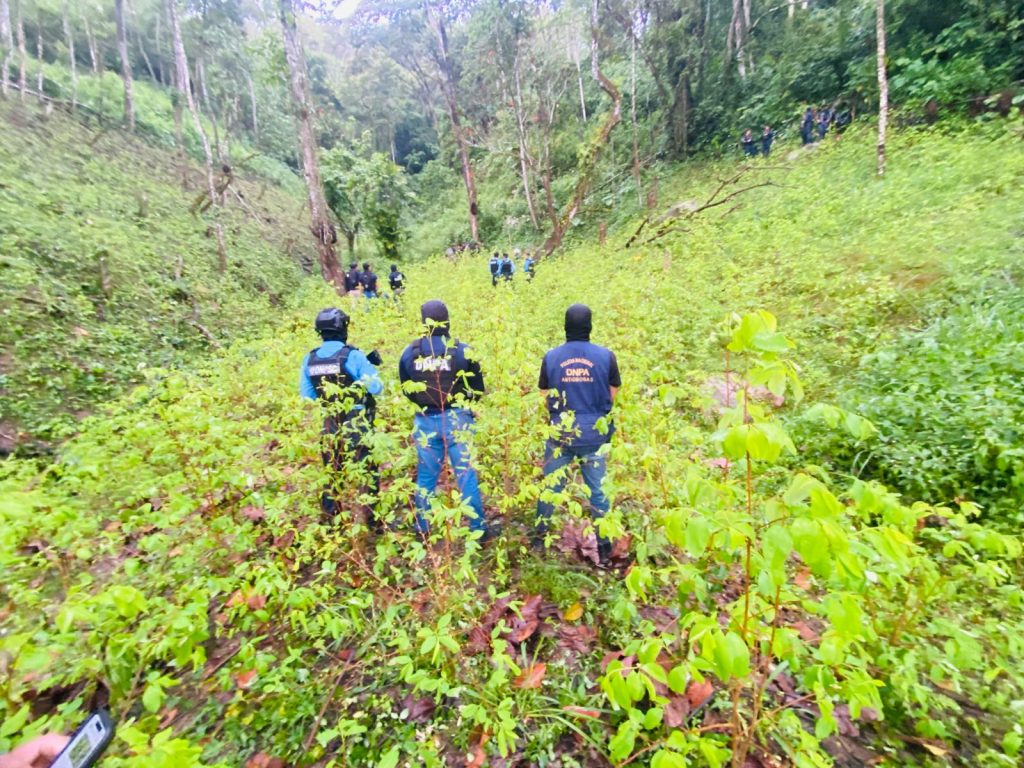 Olancho. 10 de marzo de 2026. La Dirección Nacional Policial Antidrogas (DNPA), en coordinación con agentes de la Dirección Nacional de Servicios Policiales Fronterizos (DNSPF), Dirección Nacional de Fuerzas Especiales (DNFE) y la Dirección Nacional de Prevención y Seguridad Comunitaria (DNPSC), asestó un contundente golpe al narcotráfico al ubicar y asegurar una extensa plantación de supuestos arbustos de coca, así como un laboratorio rústico.
