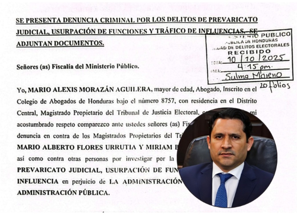 El Magistrado Propietario del Tribunal de Justicia Electoral (TJE), Mario Alexis Morazán Aguilera, ha interpuesto una denuncia ante el Ministerio Público. Los delitos señalados son prevaricato judicial, usurpación de funciones y tráfico de influencias.