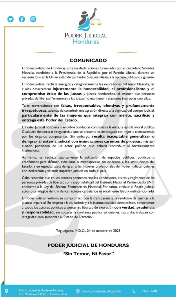 EL P.J. RECHAZA DE FORMA ENÉRGICA Y CATEGÓRICA LAS DECLARACIONES DEL CANDIDATO SALVADOR NASRALLA, QUE CONSTITUYEN UNA FALSEDAD Y UN AGRAVIO INTOLERABLE CONTRA LAS JUEZAS Y JUECES HONDUREÑOS