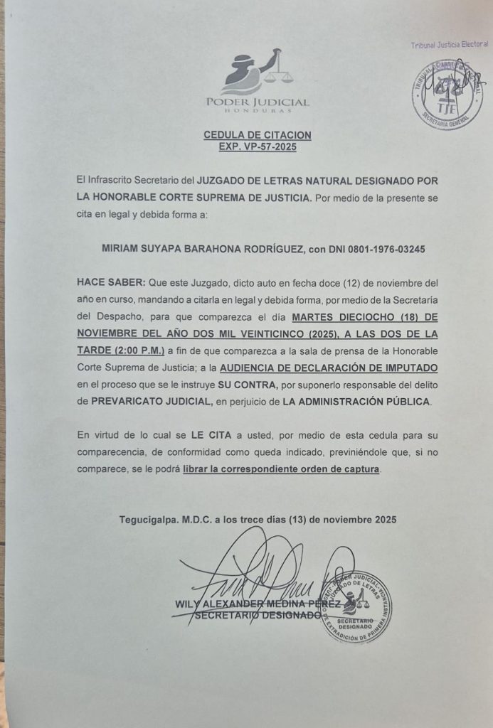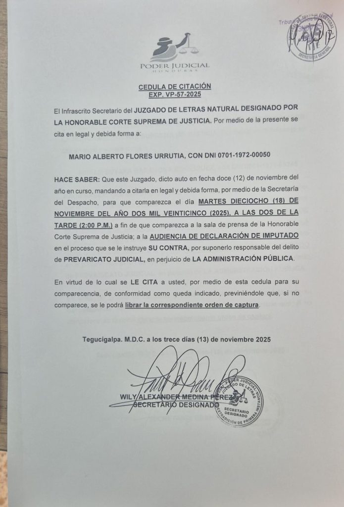 EL PODER JUDICIAL EMITIÓ UNA CITATORIO PARA LA AUDIENCIA DE DECLARACIÓN DE IMPUTADO CONTRA LOS MAGISTRADOS MARIO FLORES URRUTIA DEL PARTIDO NACIONAL Y LA LIBERAL MIRIAM SUYAPA BARAHONA, POR SUPONERLOS RESPONSABLES DEL DELITO DE PREVARICATO JUDICIAL EN PERJUICIO DE LA ADMINISTRACIÓN PÚBLICA, AL INSCRIBIR DE MANERA ILEGAL AL DIPUTADO JORGE CÁLIX POR OLANCHO.
