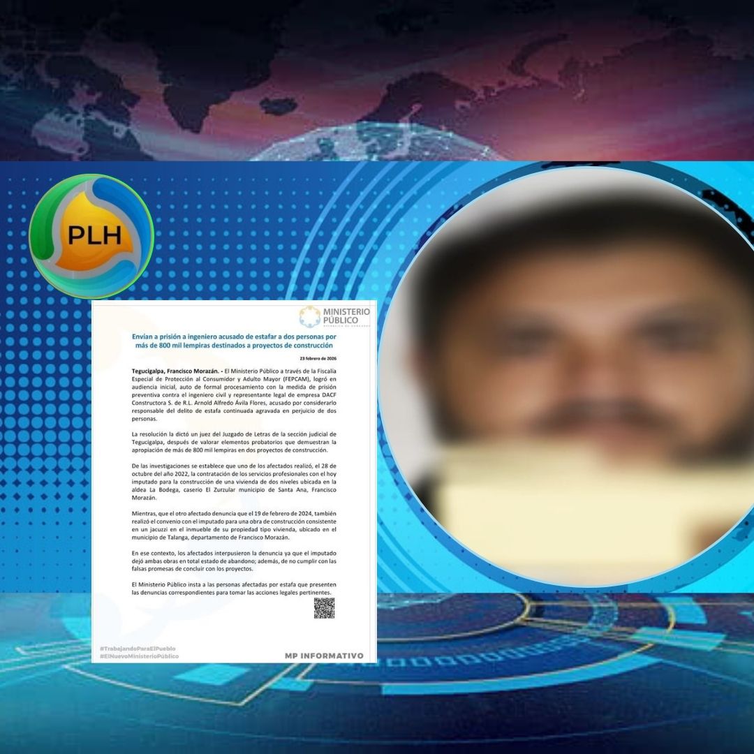 Tegucigalpa, Francisco Morazán. – El Ministerio Público a través de la Fiscalía Especial de Protección al Consumidor y Adulto Mayor (FEPCAM), logró en audiencia inicial, auto de formal procesamiento con la medida de prisión preventiva contra el ingeniero civil y representante legal de empresa DACF Constructora S. de R.L. Arnold Alfredo Ávila Flores, acusado por considerarlo responsable del delito de estafa continuada agravada en perjuicio de dos personas.