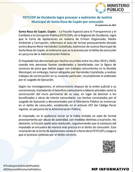 Santa Rosa de Copán, Copán. – La Fiscalía Especial para la Transparencia y el Combate a la Corrupción Pública (FETCCOP), de la Regional de Occidente, logró que la Corte de Apelaciones en materia de Crimen Organizado, Medio Ambiente y Corrupción, reformara el auto de formal procesamiento dictado contra Bayron René Hernández Castañeda, exdirector de Justicia Municipal de Santa Rosa de Copán, al ordenarse que se le procese por el delito de concusión en perjuicio de la Administración Pública.