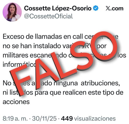 Son TOTALMENTE FALSAS las declaraciones realizadas por la consejera abogada Cossette López de que las Fuerzas Armadas realicen procesos de escaneo o verificación de credenciales de los informáticos, ya que esto es una facultad ajena al trabajo de nuestras Fuerzas Armadas, quienes han cumplido con su misión constitucional.