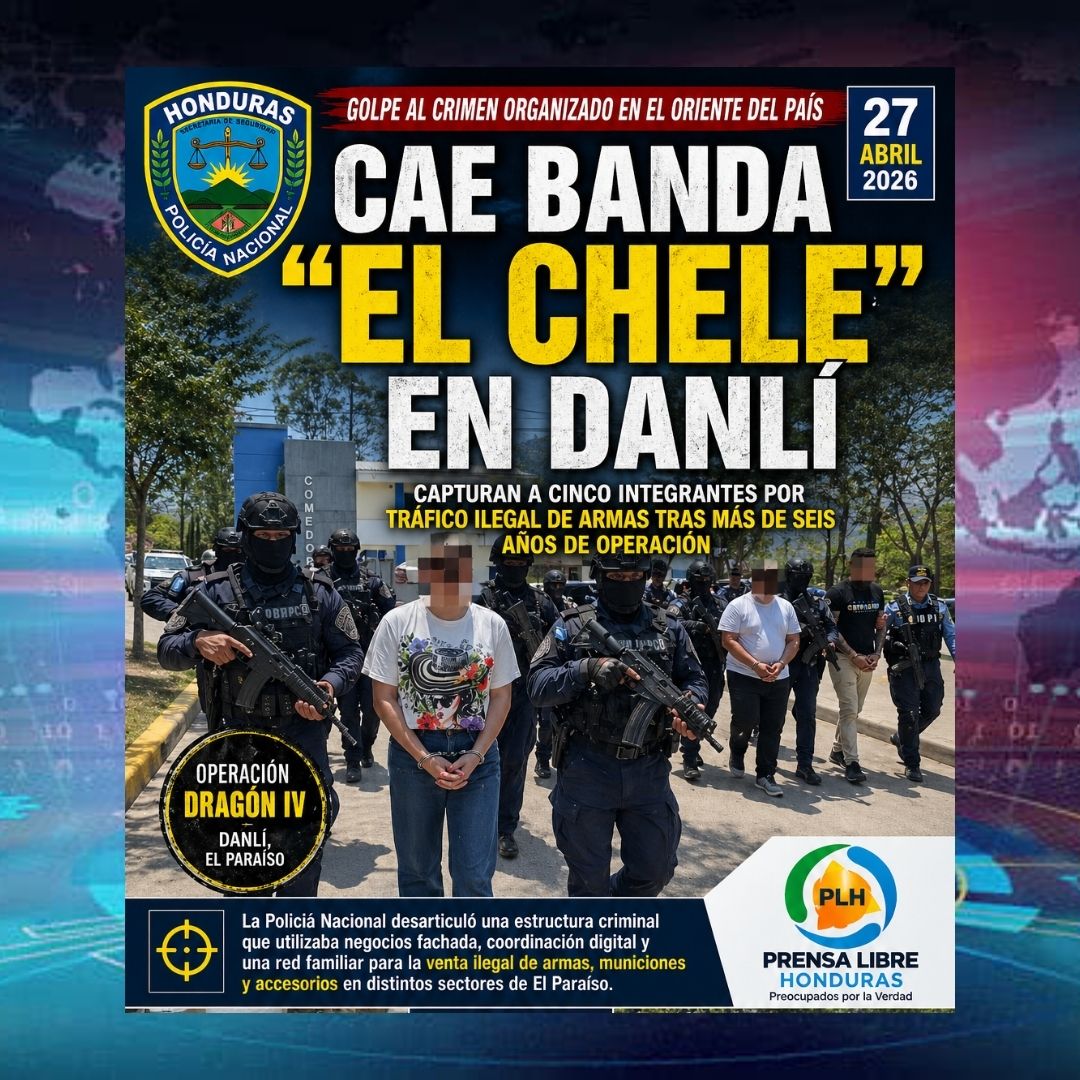 La Policía Nacional desarticuló en Danlí, El Paraíso, la estructura criminal “El Chele”, dedicada al tráfico ilegal de armas, municiones y accesorios, tras más de seis años de operaciones. Durante el operativo fueron capturados cinco integrantes, incluido su líder, José Benjamín Fonseca Montoya, quien utilizaba un negocio de ropa y calzado como fachada para la venta ilícita.
