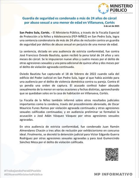 San Pedro Sula, Cortés. – El Ministerio Público, a través de la Fiscalía Especial de Protección a la Niñez y Adolescencia (FEP-NIÑEZ) en San Pedro Sula, logra una sentencia condenatoria de más de 24 años de reclusión contra un guardia de seguridad por delitos de abuso sexual en perjuicio de una menor de edad.