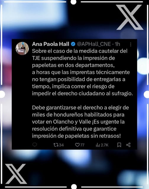 La presidenta del CNE Ana Paola Hall lamentó que el Tribunal de Justicia Electoral (TJE) suspendiera la impresión de papeletas en Olancho y Valle mediante una medida cautelar, por lo que advirtió que esto pone en riesgo el derecho al voto, dado que las imprentas ya no podrán entregarlas a tiempo.