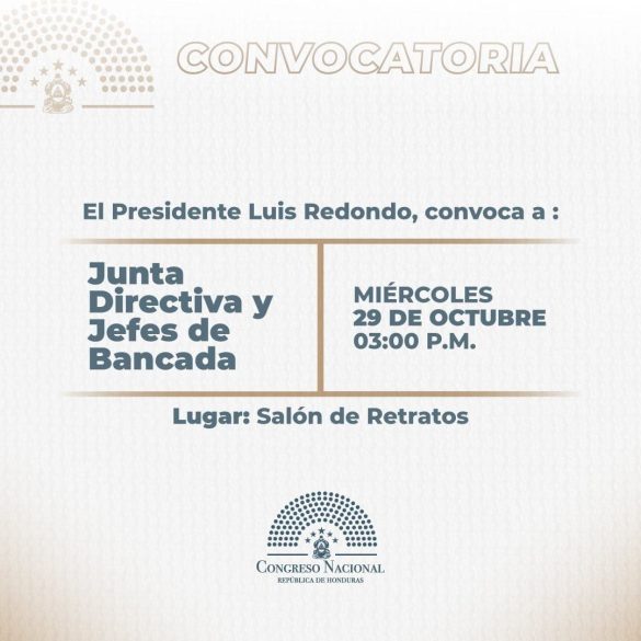 El presidente del Congreso Nacional, Luis Redondo, emitió convocatoria dirigida a la Junta Directiva y a los jefes de bancada para sesionar el miércoles 29 de octubre a las 3:00 p.m. en el Salón de Retratos del Poder Legislativo.