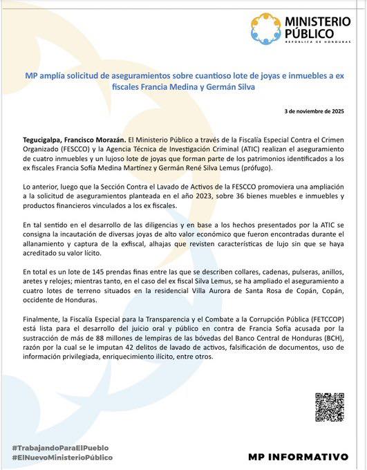 En total es un lote de 145 prendas finas entre las que se describen collares, cadenas, pulseras, anillos, aretes y relojes; mientras tanto, en el caso del ex fiscal Silva Lemus, se ha ampliado el aseguramiento a cuatro lotes de terreno situados en la residencial Villa Aurora de Santa Rosa de Copán, Copán, occidente de Honduras. Finalmente, la Fiscalía Especial para la Transparencia y el Combate a la Corrupción Pública (FETCCOP) está lista para el desarrollo del juicio oral y público en contra de Francia Sofía acusada por la sustracción de más de 88 millones de lempiras de las bóvedas del Banco Central de Honduras (BCH), razón por la cual se le imputan 42 delitos de lavado de activos, falsificación de documentos, uso de información privilegiada, enriquecimiento ilícito, entre otros.