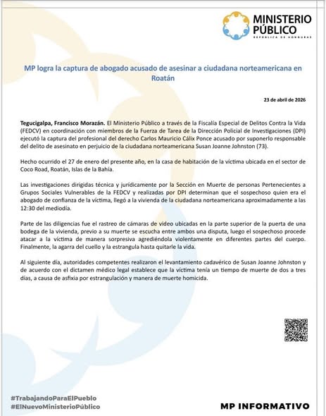Tegucigalpa, Francisco Morazán. El Ministerio Público a través de la Fiscalía Especial de Delitos Contra la Vida (FEDCV) en coordinación con miembros de la Fuerza de Tarea de la Dirección Policial de Investigaciones (DPI) ejecutó la captura del profesional del derecho Carlos Mauricio Cálix Ponce acusado por suponerlo responsable del delito de asesinato en perjuicio de la ciudadana norteamericana Susan Joanne Johnston (72).