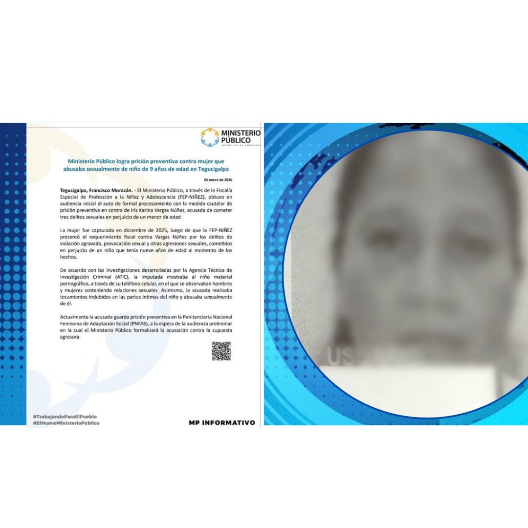Tegucigalpa, Francisco Morazán. – El Ministerio Público, a través de la Fiscalía Especial de Protección a la Niñez y Adolescencia (FEP-NIÑEZ), obtuvo en audiencia inicial el auto de formal procesamiento con la medida cautelar de prisión preventiva en contra de Iris Karina Vargas Núñez, acusada de cometer tres delitos sexuales en perjuicio de un menor de edad.
