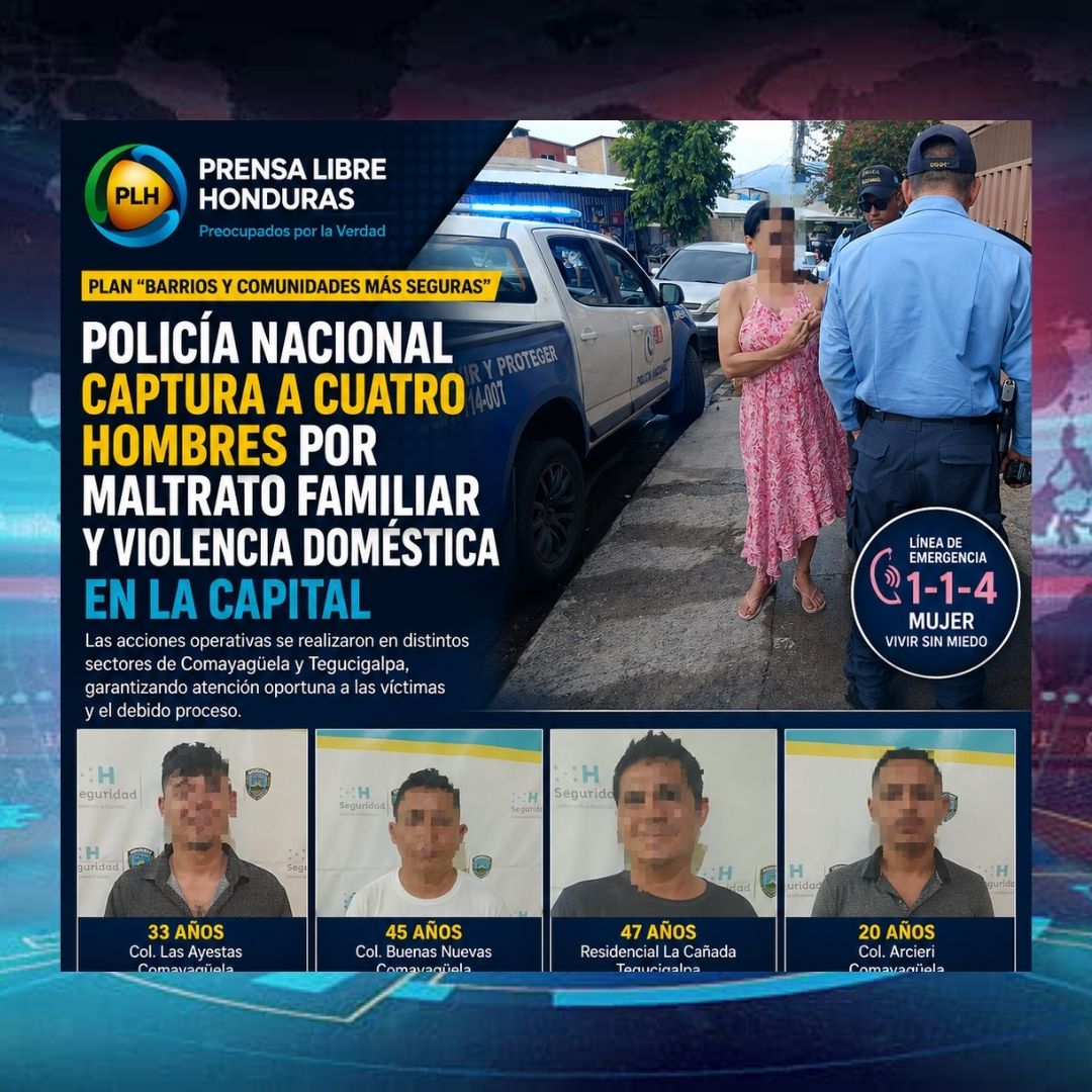 En el marco del plan “Barrios y Comunidades Más Seguras”, la Policía Nacional ejecutó una serie de operativos en Tegucigalpa y Comayagüela que resultaron en la detención de cuatro hombres, señalados por suponerlos responsables de los delitos de maltrato familiar y violencia doméstica.