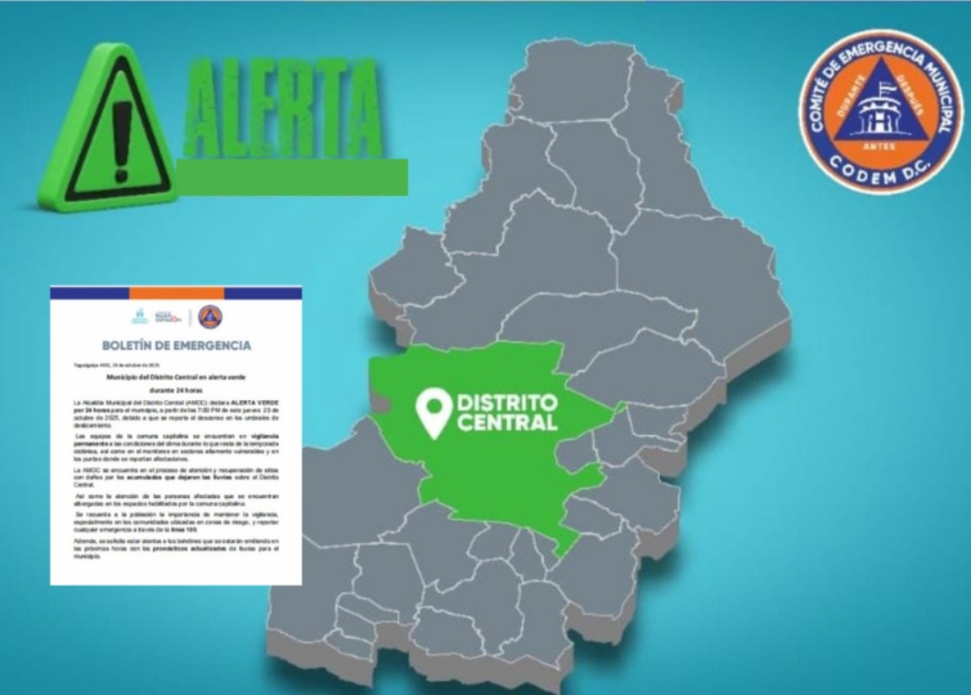 La Alcaldía Municipal del Distrito Central (AMDC) declara ALERTA VERDE por 24 horas para el municipio, a partir de las 7:00 PM de este jueves 23 de octubre de 2025, debido a que se reporta el descenso en los umbrales de deslizamiento.