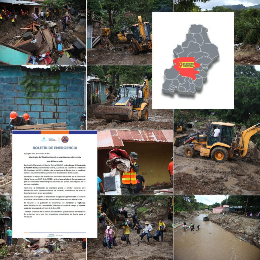 La Alcaldía Municipal del Distrito Central (AMDC) extiende por 48 horas más la ALERTA ROJA para el Distrito Central, a partir de las 7:00 PM de este lunes 20 de octubre de 2025, debido a los pronósticos de lluvias para el municipio durante las próximas horas y al alto nivel de saturación de los suelos.