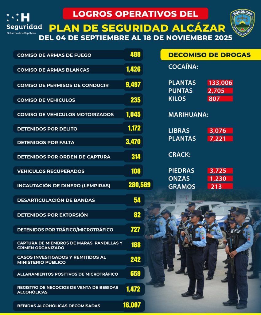 Tegucigalpa 19 de noviembre del 2025.- La Policía Nacional mantiene su operatividad firme y sostenida en el marco del Plan Alcázar, logrando importantes resultados en los municipios de mayor incidencia del país. Estas acciones reflejan un trabajo articulado orientado a la prevención, neutralización del delito y fortalecimiento del orden público.
