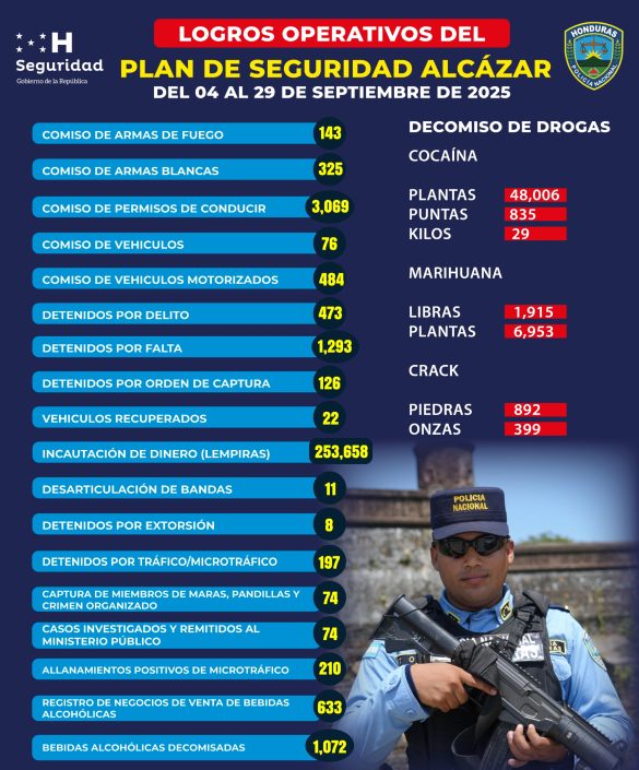 Tegucigalpa. 30 de septiembre de 2025. – La Secretaría de Estado en el Despacho de Seguridad, por medio de la Policía Nacional, ha obtenido importantes resultados mediante la ejecución del Plan Alcázar, una estrategia de seguridad que ha generado un duro golpe a las estructuras delictivas en las principales ciudades del país.