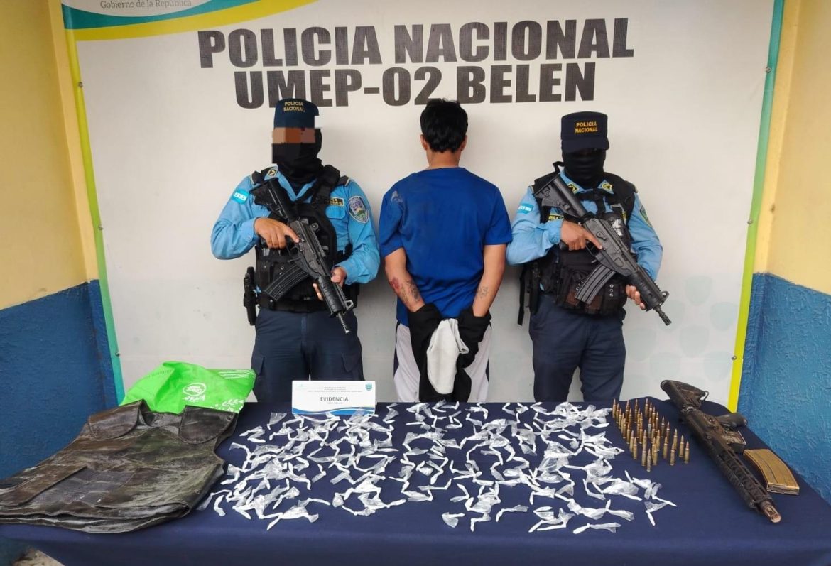 Comayagüela Lunes 12 de enero del año 2025. Mediante labores de patrullaje preventivo, agentes policiales asignados al Distrito Policial 2-2 Campo Cielo de la Unidad Metropolitana de Prevención N⁰2 (UMEP-2),realizaron la aprehensión de un ciudadano del sexo masculino en la colonia Cantarero López, por suponerlo responsable de los delitos de tráfico de drogas y porte ilegal de arma de fuego de uso prohibido.