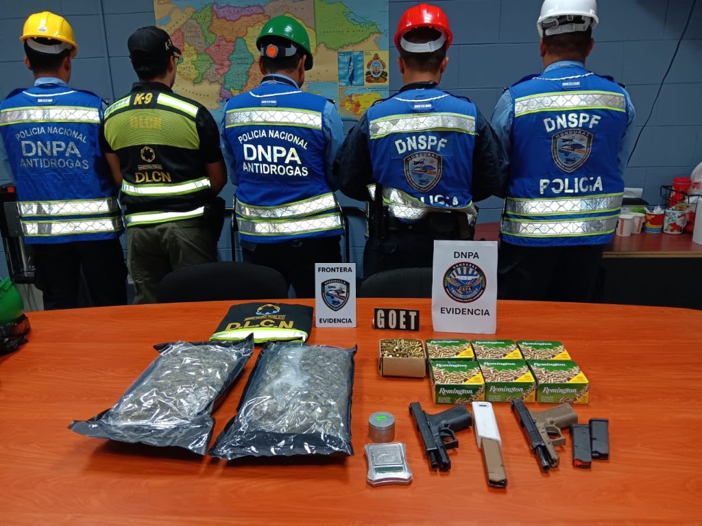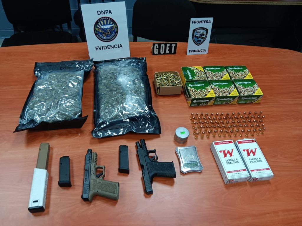 Puerto Cortés. 23 de enero de 2026. Tras una minuciosa inspección a un contenedor ubicado en la Operadora Portuaria Centroamericana (OPC), agentes de la Dirección Nacional Policial Antidrogas (DNPA), en coordinación con la Dirección Nacional de Servicios Policiales Fronterizos (DNSPF), lograron el decomiso de armas de fuego, municiones y supuesta marihuana.
