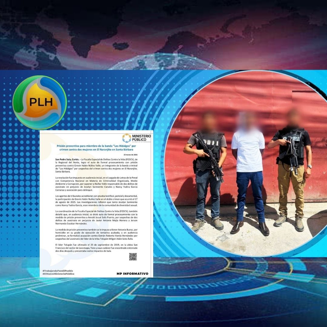 San Pedro Sula, Cortés. – La Fiscalía Especial de Delitos Contra la Vida (FEDCV), de la Regional del Norte, logra el auto de formal procesamiento con prisión preventiva contra Grevin Habin Núñez Valle, un integrante de la banda criminal de “Los Hidalgos” por sospechas del crimen contra dos mujeres en El Naranjito, Santa Bárbara.