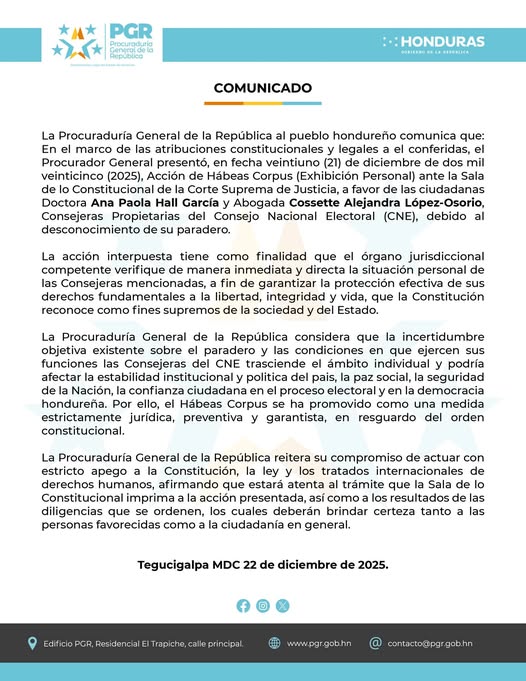 Inicio » PROCURADOR GENERAL PRESENTA ACCIÓN DE HÁBEAS CORPUS (EXHIBICIÓN PERSONAL) POR DESCONOCIMIENTO DEL PARADERO Y POSIBLE RETENCIÓN ILEGÍTIMA DE LAS CONSEJERAS DEL CNE