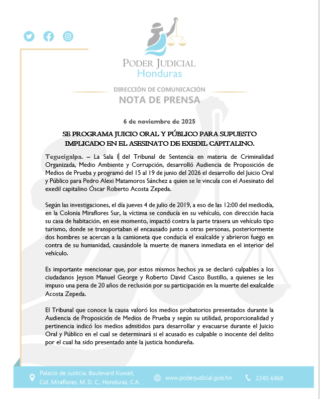 Sala I del Tribunal de Sentencia en materia de Criminalidad Organizada, Medio Ambiente y Corrupción programa Juicio Oral y Público para supuesto implicado en el Asesinato del exalcalde capitalino Óscar Roberto Acosta Zepeda.