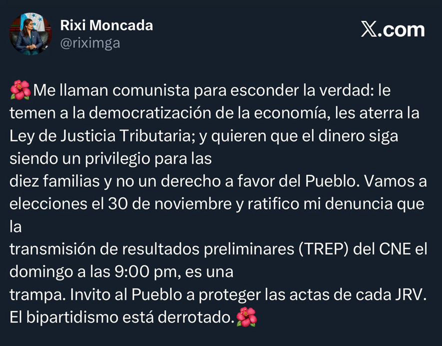 La candidata presidencial de Libre, Rixi Moncada, aseguró que la llaman “comunista” para ocultar la verdad: les preocupa la democratización de la economía, temen la Ley de Justicia Tributaria y defienden que el dinero siga siendo privilegio de diez familias en lugar de un derecho del Pueblo.