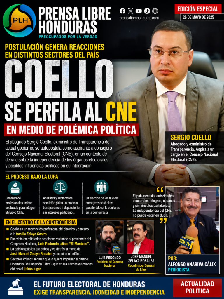 Tegucigalpa, Honduras.– El abogado hondureño Sergio Coello ha presentado su autopostulación para aspirar a un cargo como consejero del Consejo Nacional Electoral (CNE), en un contexto marcado por intensos movimientos políticos y discusiones sobre la integración de los órganos electorales del país.