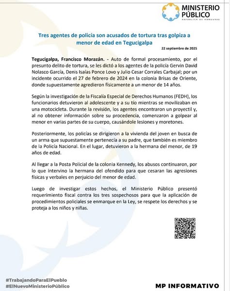 Tegucigalpa, Francisco Morazán. – Auto de formal procesamiento, por el presunto delito de tortura, se les dictó a los agentes de la policía Gervin David Nolasco García, Denis Isaías Ponce Lovo y Julio Cesar Corrales Carbajal; por un incidente ocurrido el 27 de febrero de 2024 en la colonia Brisas de Oriente, donde supuestamente agredieron físicamente a un menor de 14 años.