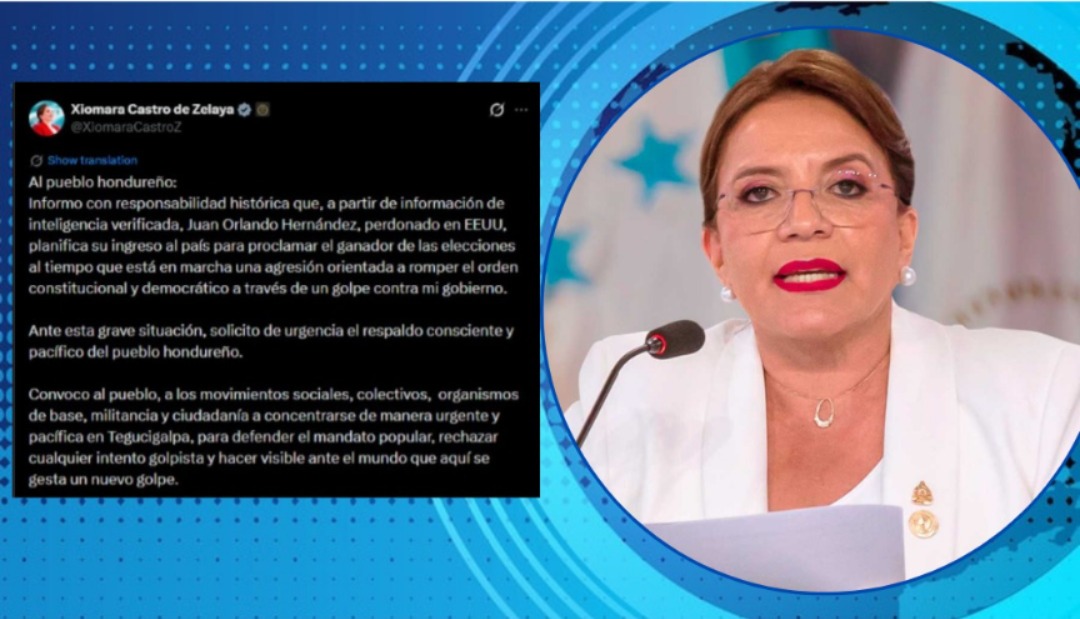 Al pueblo hondureño: Informo con responsabilidad histórica que, a partir de información de inteligencia verificada, Juan Orlando Hernández, perdonado en EEUU, planifica su ingreso al país para proclamar el ganador de las elecciones al tiempo que está en marcha una agresión orientada a romper el orden constitucional y democrático a través de un golpe contra mi gobierno.